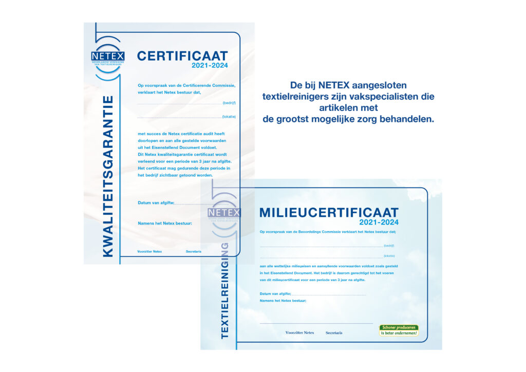 - NETEX CertificeringDe NETEX textielreiniger biedt de beste kwaliteit, service en duurzaamheid… Lees meer: NETEX Certificering