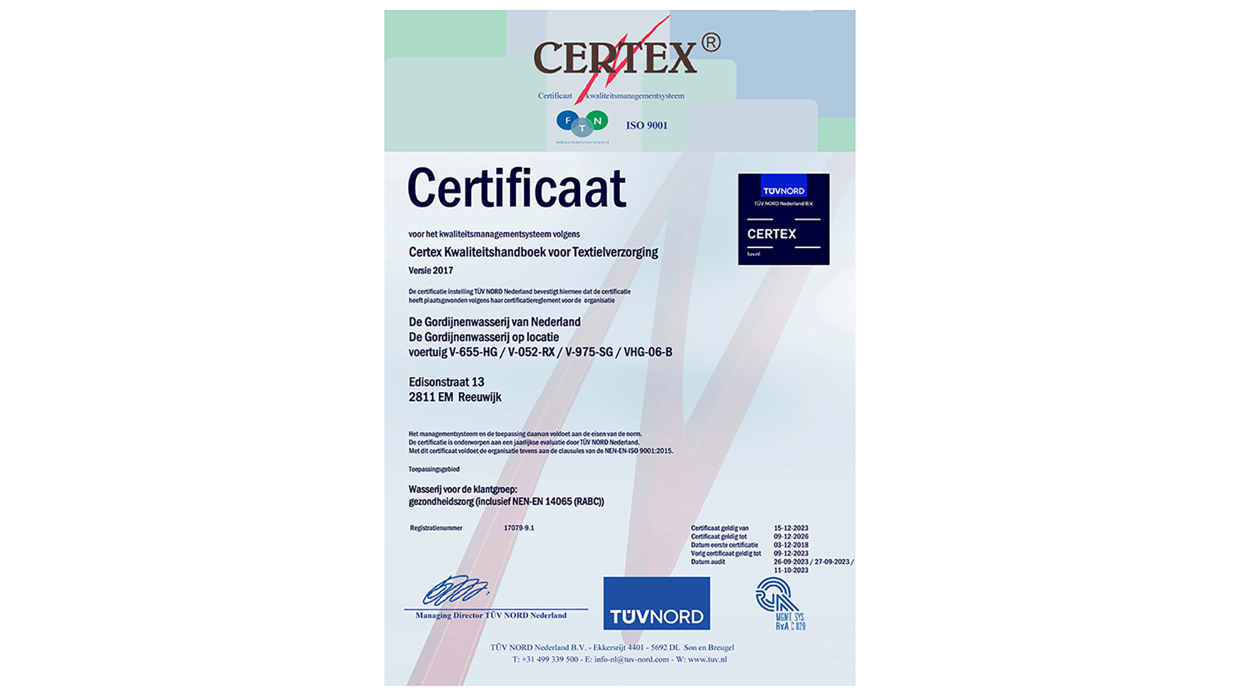 TÜV Nord Nederland heeft onlangs de her-certificerings audit uitgevoerd bij De Gordijnenwasserij van Nederland (en op locatie) te Reeuwijk, om het bedrijf opnieuw te kunnen certificeren voor een periode van 3 jaar. Dit is positief beoordeeld en het certificaat is verstrekt!